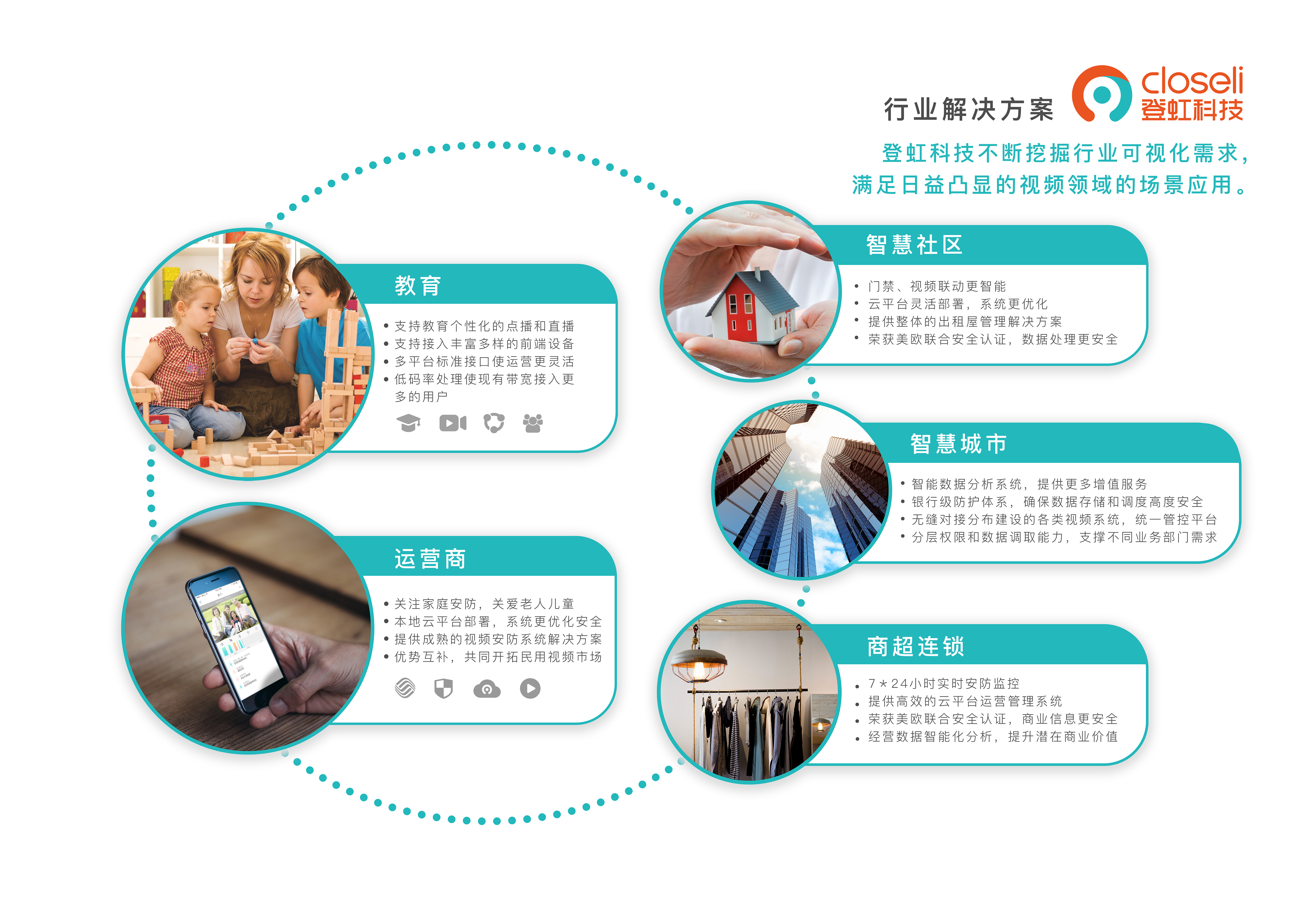 在企业用户领域,登虹科技面向学校教育、商业连锁、智慧农业、移动互联网、车联网等行业,提供视频采集、 处理、分发,消息推送,视频内容智能分析,视频大数据分析,终端播放等一系列的解决方案。