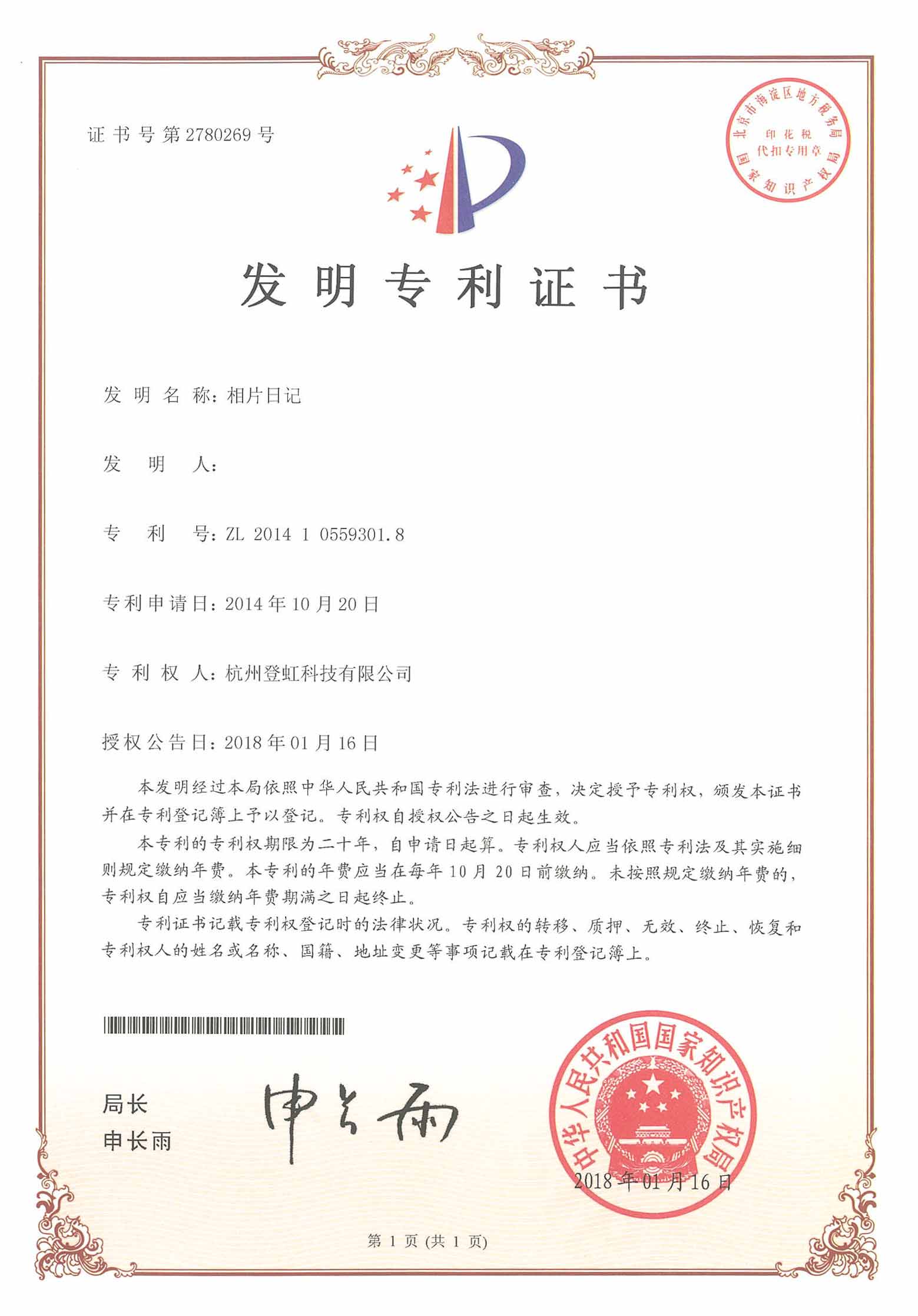 近日,杭州登虹科技有限公司(Closeli)“相片日记”技术成果获国家发明专利授权,专利号:ZL 2014 1 0559301.8。